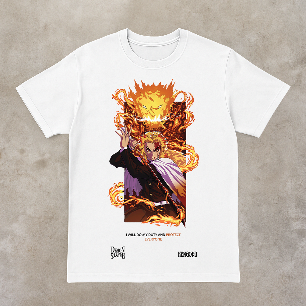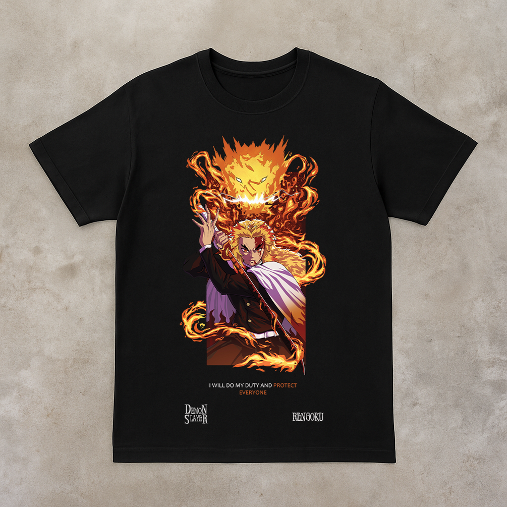 Honor the legacy of Kyojuro Rengoku from Demon Slayer: Kimetsu no Yaiba with this powerful, flame-filled design. Featuring bold colors, dynamic fire effects, and a commanding pose, this piece is built to inspire.